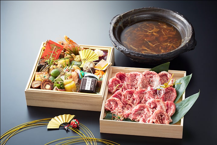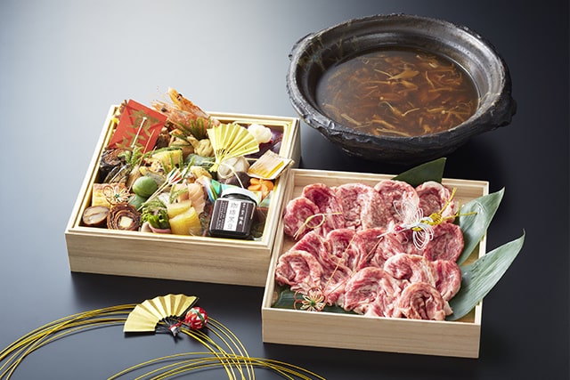 お節の枠にとらわれない幅広いラインナップ。お節と「魚骨のスープのしゃぶしゃぶ」のセットや、特製の木の子出汁でお召し上がりいただく「木の子の和牛しゃぶ」セットがございます。